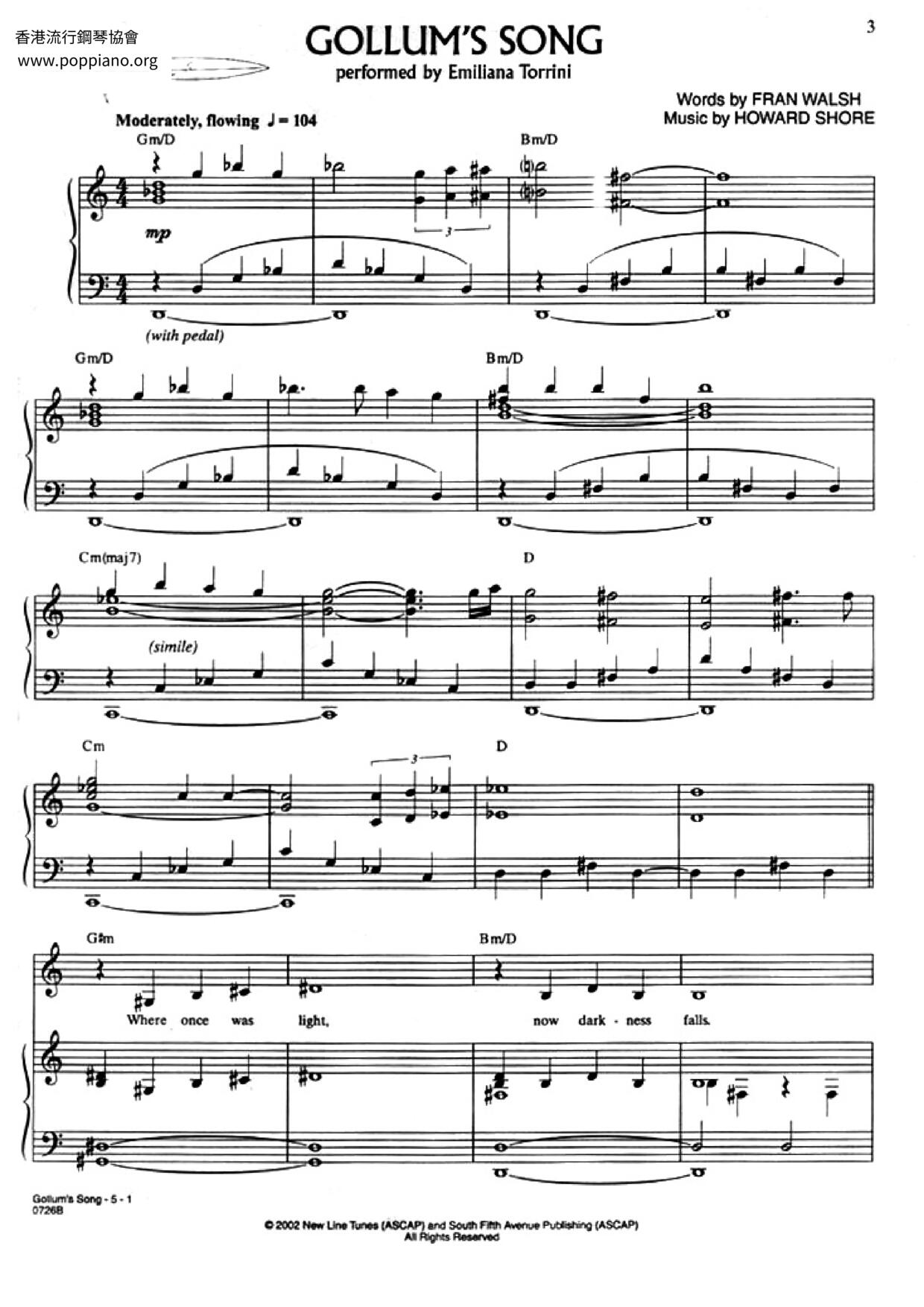 The Lord of the Rings - Gollum's Song (Howard Shore) 琴谱