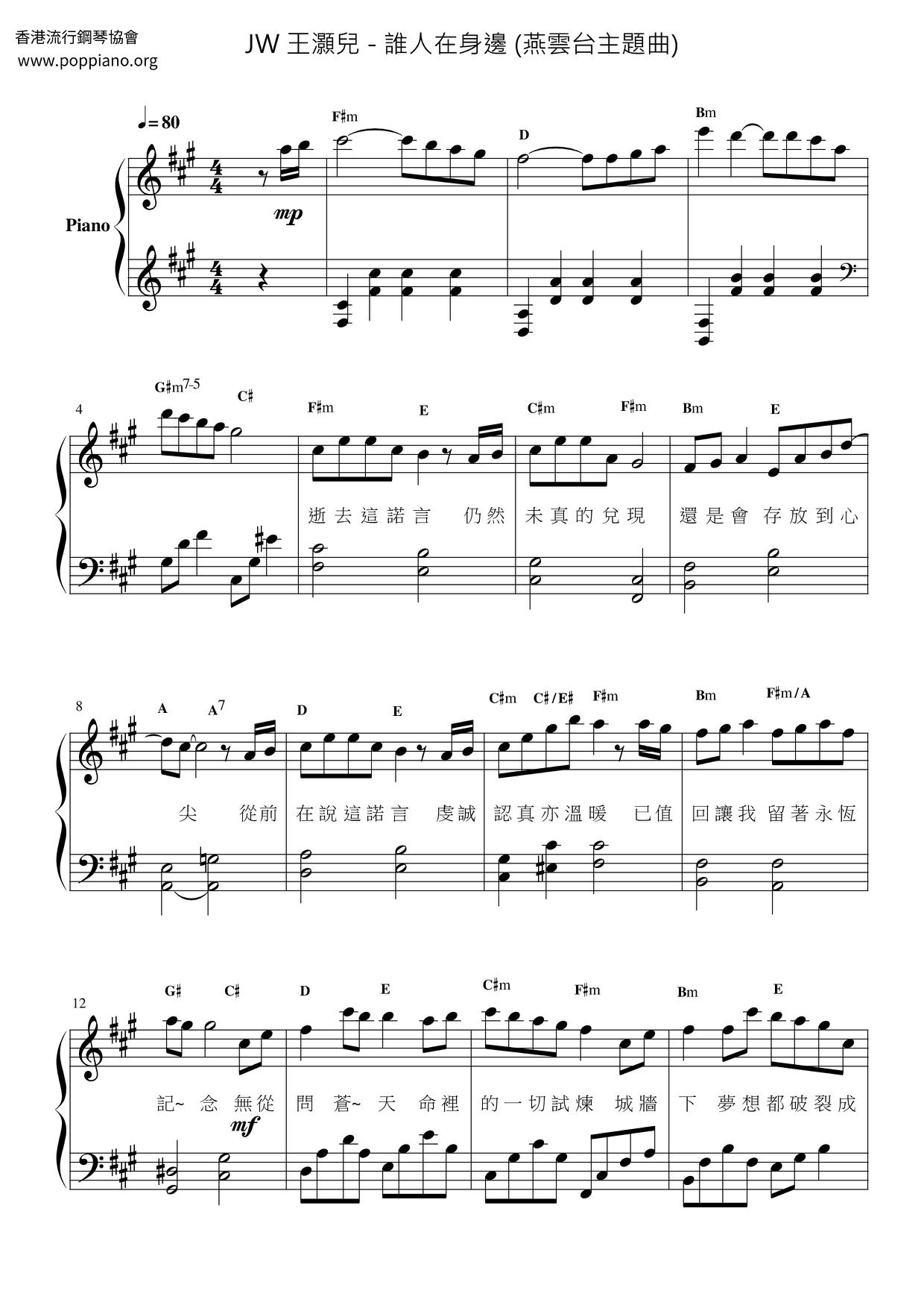 Joey Wong - Who Is By My Side (Yanyuntai Theme Song) (Sheet Music)