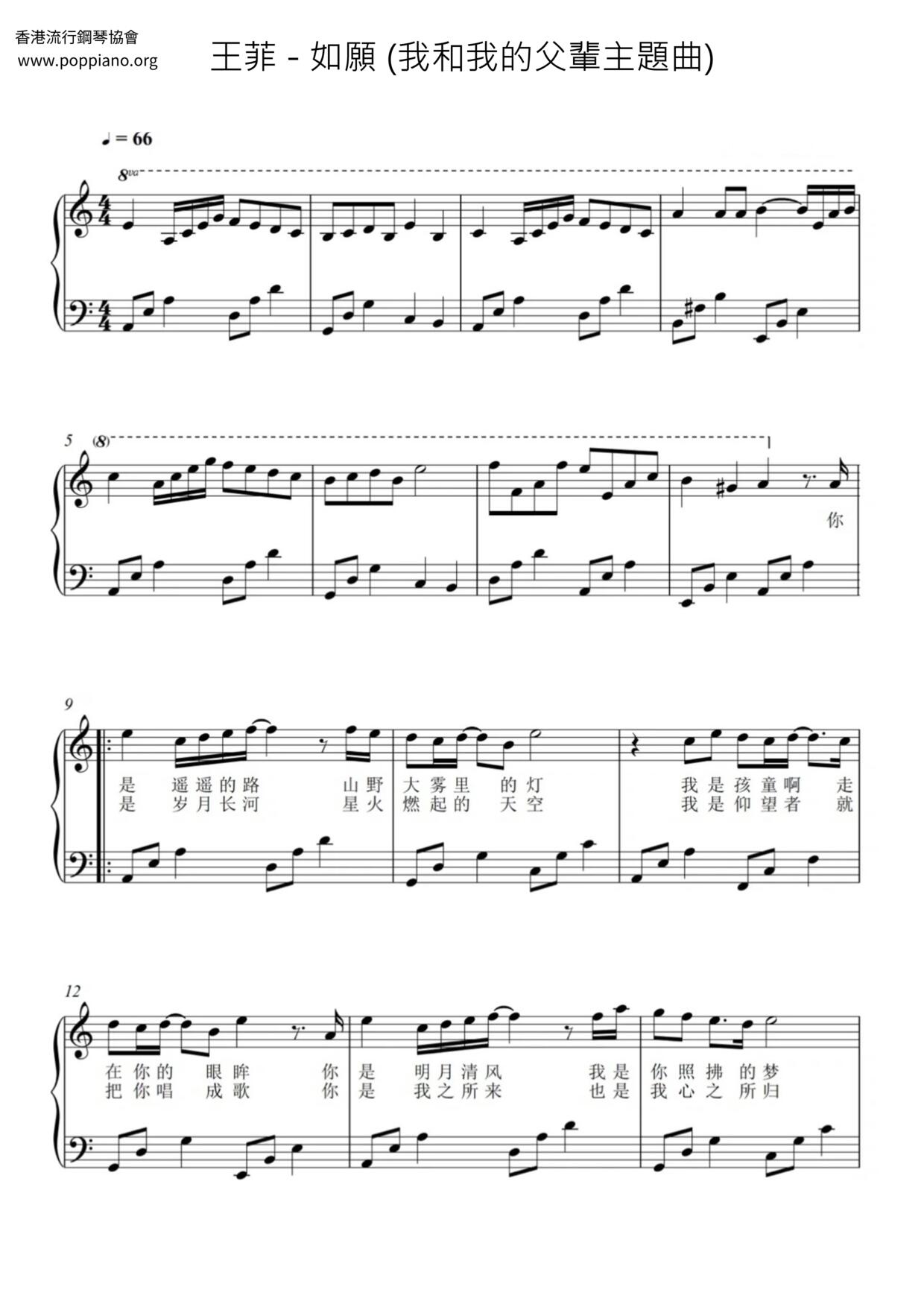 王菲 - 如願 (我和我的父輩主題曲) (琴譜)